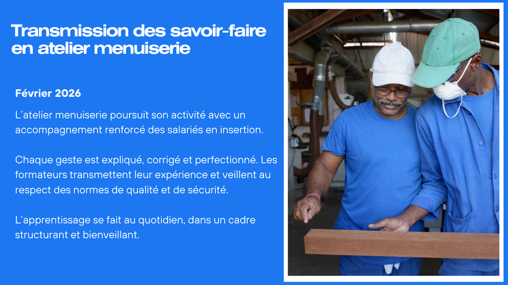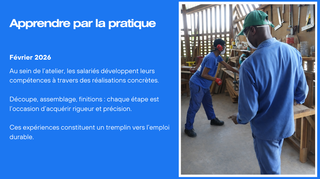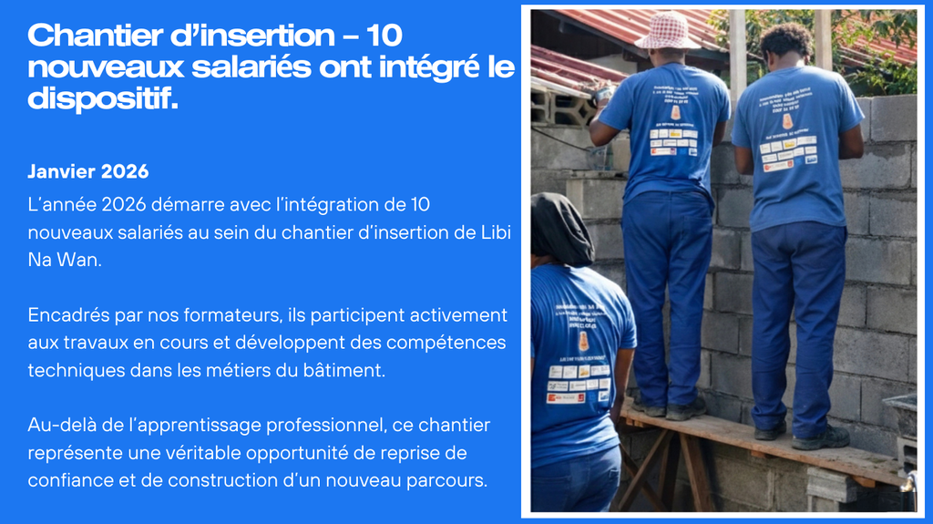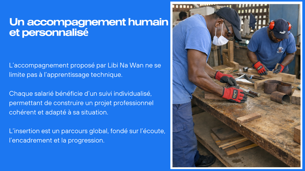 LIBI NA WAN est porteuse de deux ACI (Atelier et Chantier d’Insertion), une en Menuiserie d’Art (menuiserie bois de Guyane) et une en BTP (métier du bâtiment). Les salariés suivent une formation technique avec leur ETI (Encadrant Technique d’Insertion) en lien avec le métier visé.